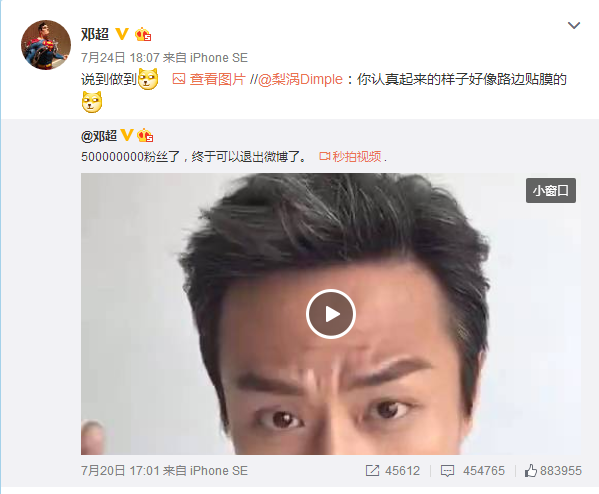 近日,邓超为了庆祝微博粉丝破5000万而上传一段自拍视频,表示这是一个大日子,要跟大家一起嗨,并送出福利,称将满足一位留言网友对他的要求。随后,就有粉丝调侃表示“你认真起来的样子好像路边贴膜的”,7月24日,邓超转发此网友微博,并写道:“说到做到!”还真奉上天桥上贴膜的照片,照片中,邓超反戴棒球帽,坐在天桥边,认真贴手机膜,看上去如路人,画面再现逗比属性。逗乐众网友,真是一位说到做到的“耿直BOY”。